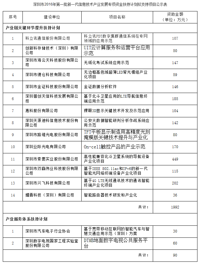 2016年第一批新一代信息技术产业发展专项资金扶持计划公示的通知(2016.08.26)