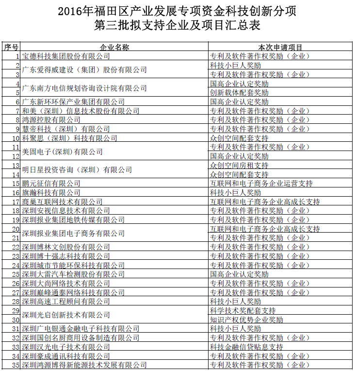 福田区产业资金科技创新分项第三批拟支持企业及项目公示(16.11.07-11.12)