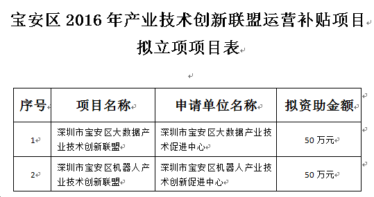 宝安区2016年产业技术创新联盟运营补贴项目拟立项公示 (16.11.23)