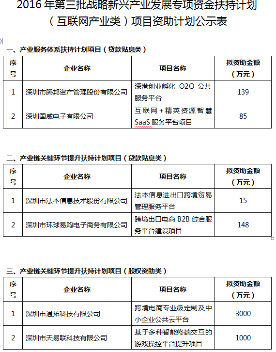 2016年第三批战略新兴产业发展专项资金扶持计划(互联网产业类)项目资助计划 公示(16.11.03)