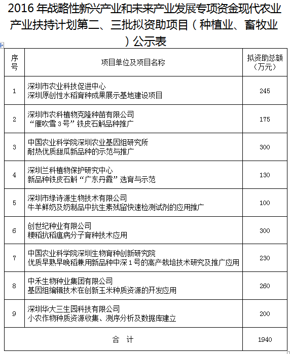2016年战略性新兴产业和未来产业发展专项资金现代农业产业扶持计划第二、三批项目(种植业、畜牧业)公示(16.11.08)