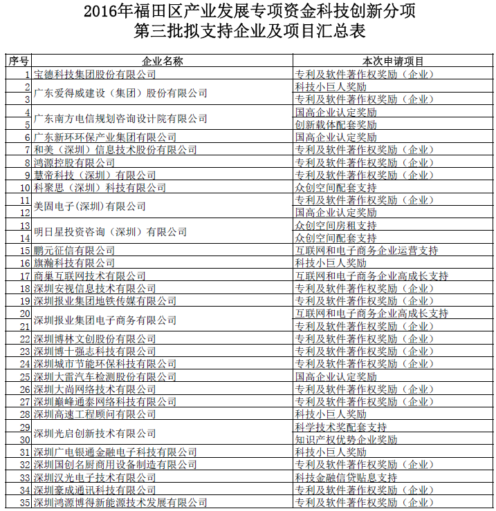 福田区产业资金科技创新分项第三批拟支持企业及项目公示(16.11.07-11.12)