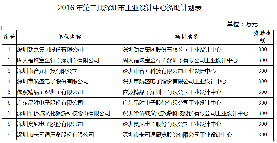 2016年深圳市工业设计中心第二批资助计划的通知(16.11.11)