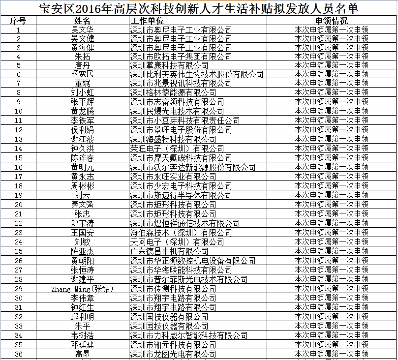 宝安区2016年高层次科技创新人才生活补贴项目拟立项公示(16.11.16)
