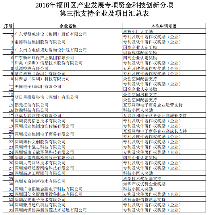 福田区产业资金科技创新分项第三批支持企业及项目公告(16.11.18)