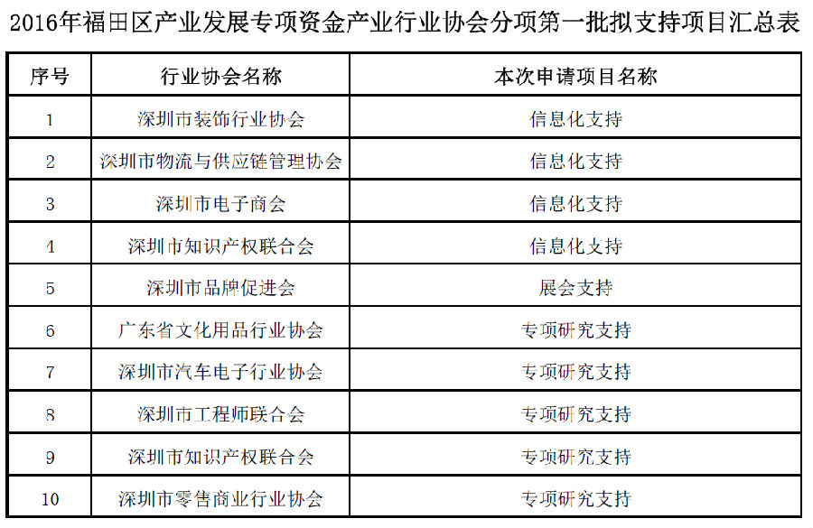 福田区产业资金产业行业协会分项第一批拟支持项目公示(16.11.23-11.29)