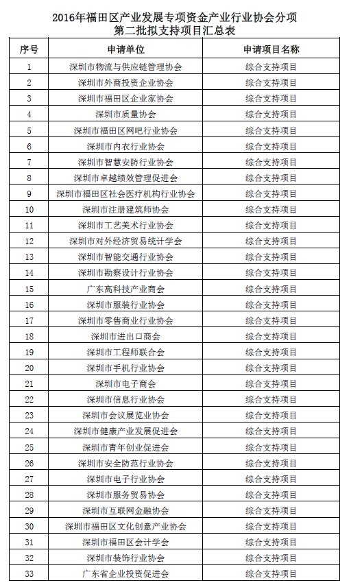 福田区产业资金产业行业协会分项第二批拟支持项目公示 编码:1209121516
